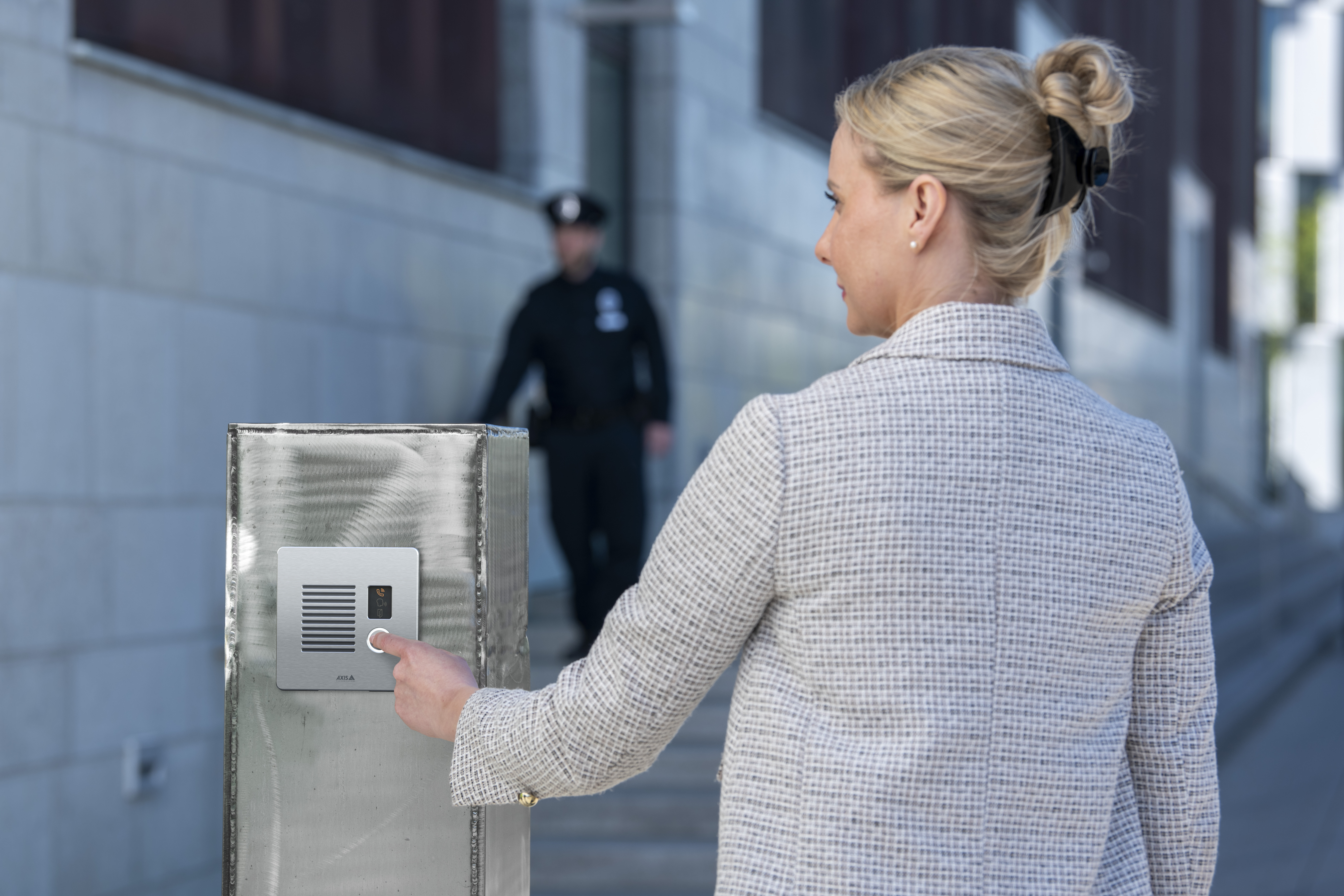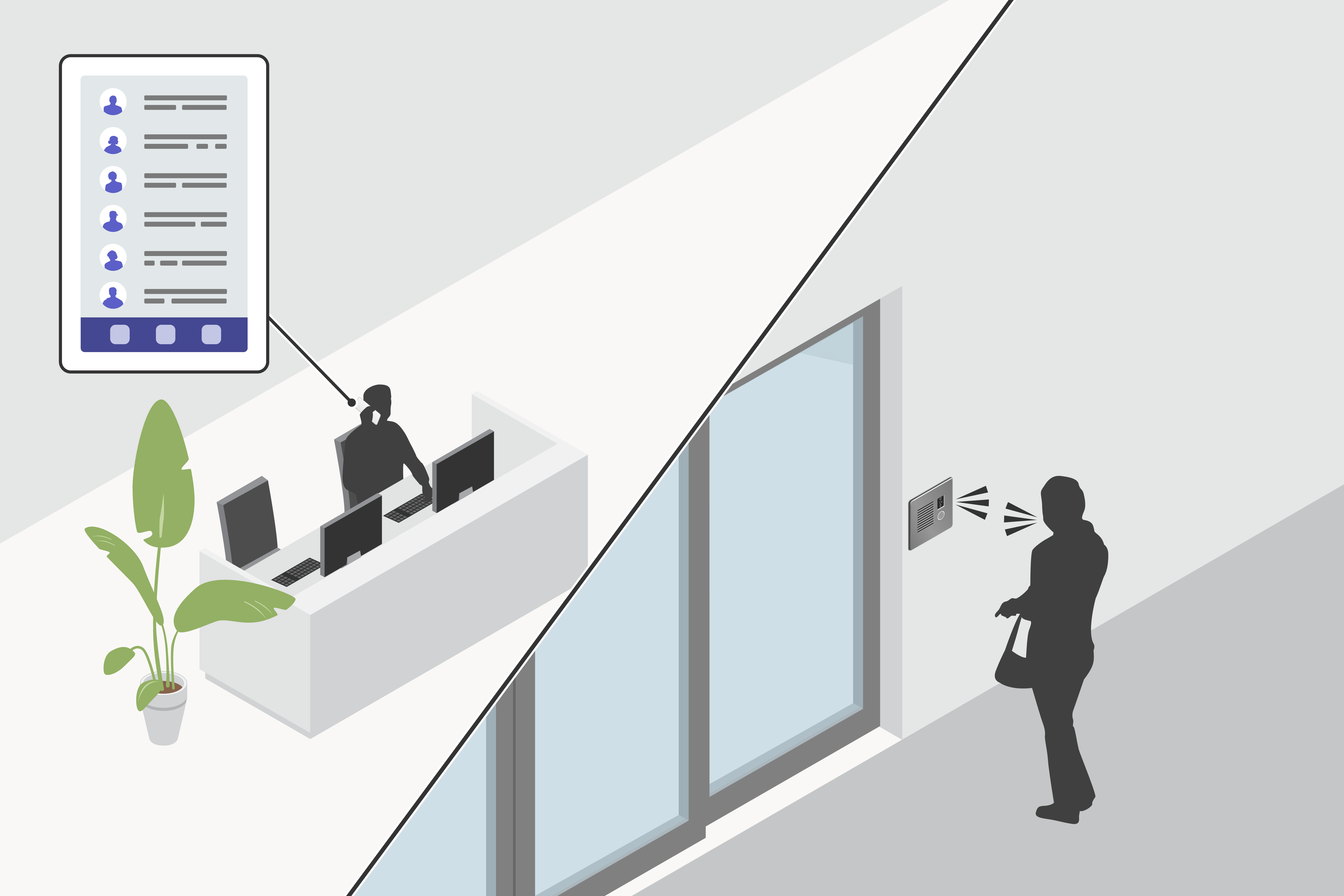 Dans les entreprises où la sécurité est primordiale et où l'accès aux bâtiments est contrôlé, AXIS Client for Unified Communication Systems peut être utilisé à des fins différentes. Par exemple, les visiteurs peuvent contacter la réception via l'interphone situé à l'entrée et demander l'accès au bâtiment.