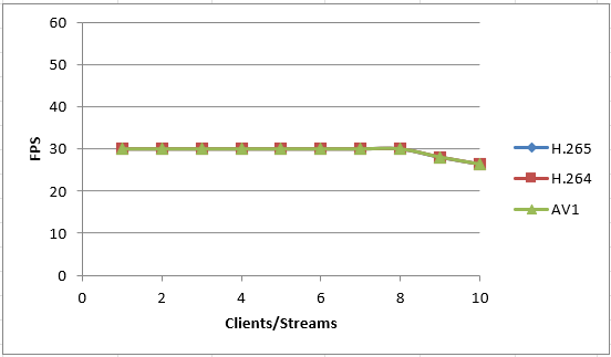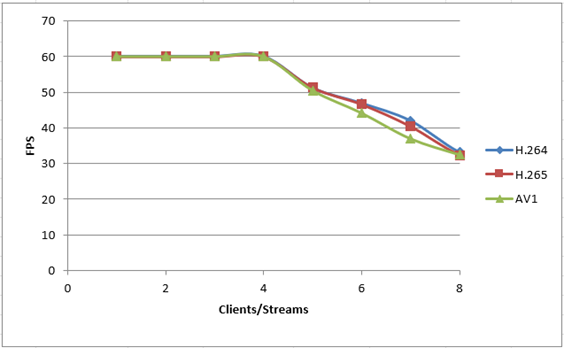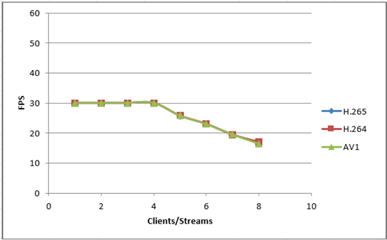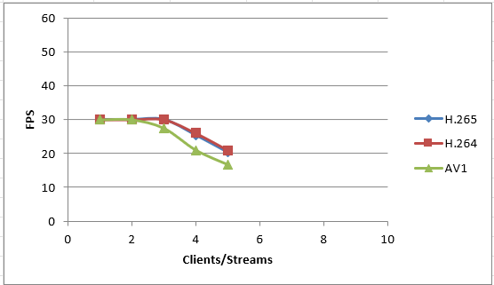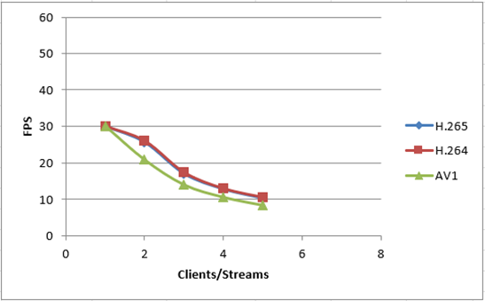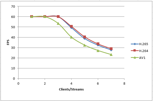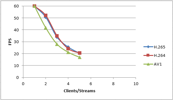 En comparant les performances de l'AV1 à celles du H.264/H.265 en termes de nombre de flux et de fréquence d'image, on constate une légère différence. Malgré sa plus grande complexité d'encodage, les performances de l'AV1 sont légèrement inférieures en raison des exigences informatiques accrues.